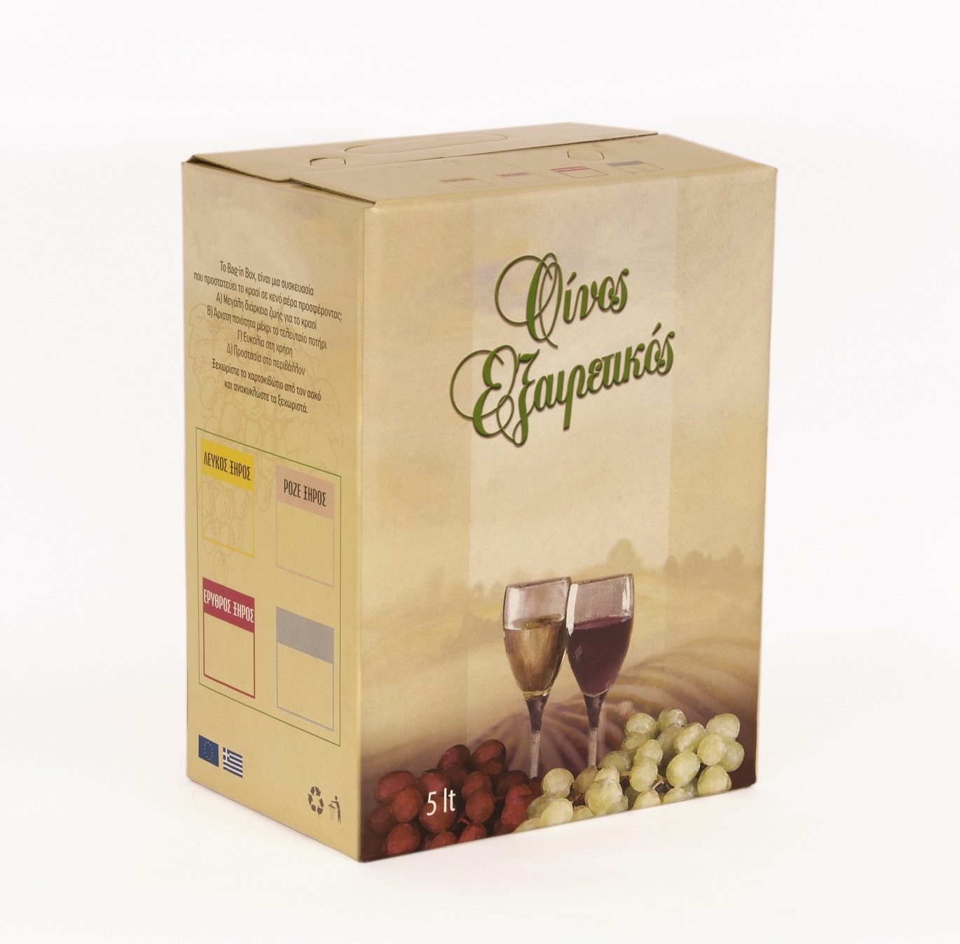 - Όλα τα χαρτοκιβώτια φέρουν ενδείξεις για "λευκό", "ροζέ" ή "ερυθρό" οίνο καθώς και εγκοπή για τη μεταφορά τους. - Το χαρτοκιβώτιο κλείνει πάνω με χρήση ταινίας και κάτω αυτόματα.